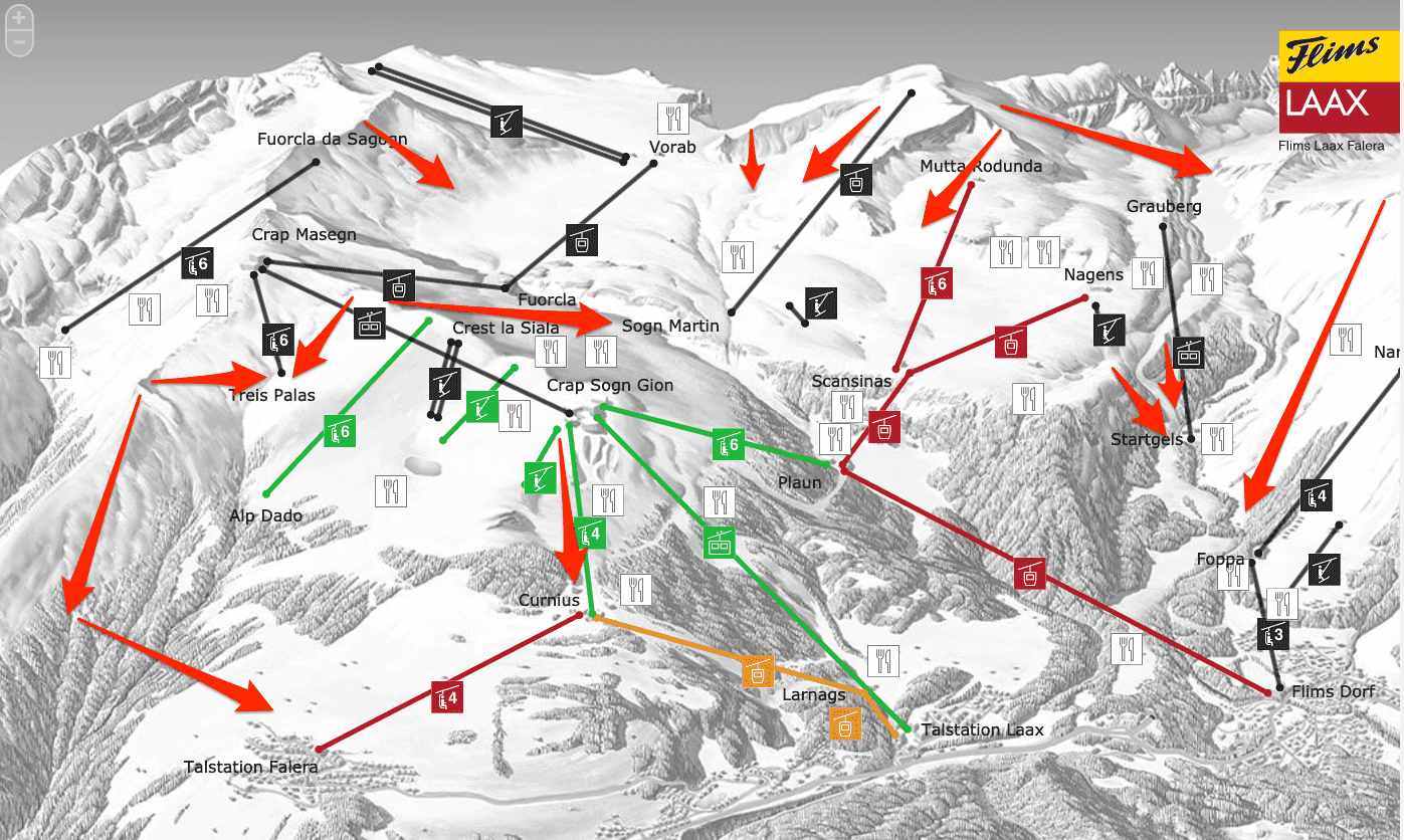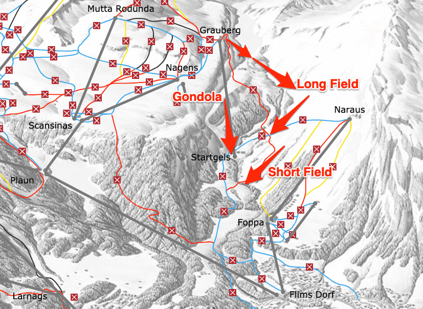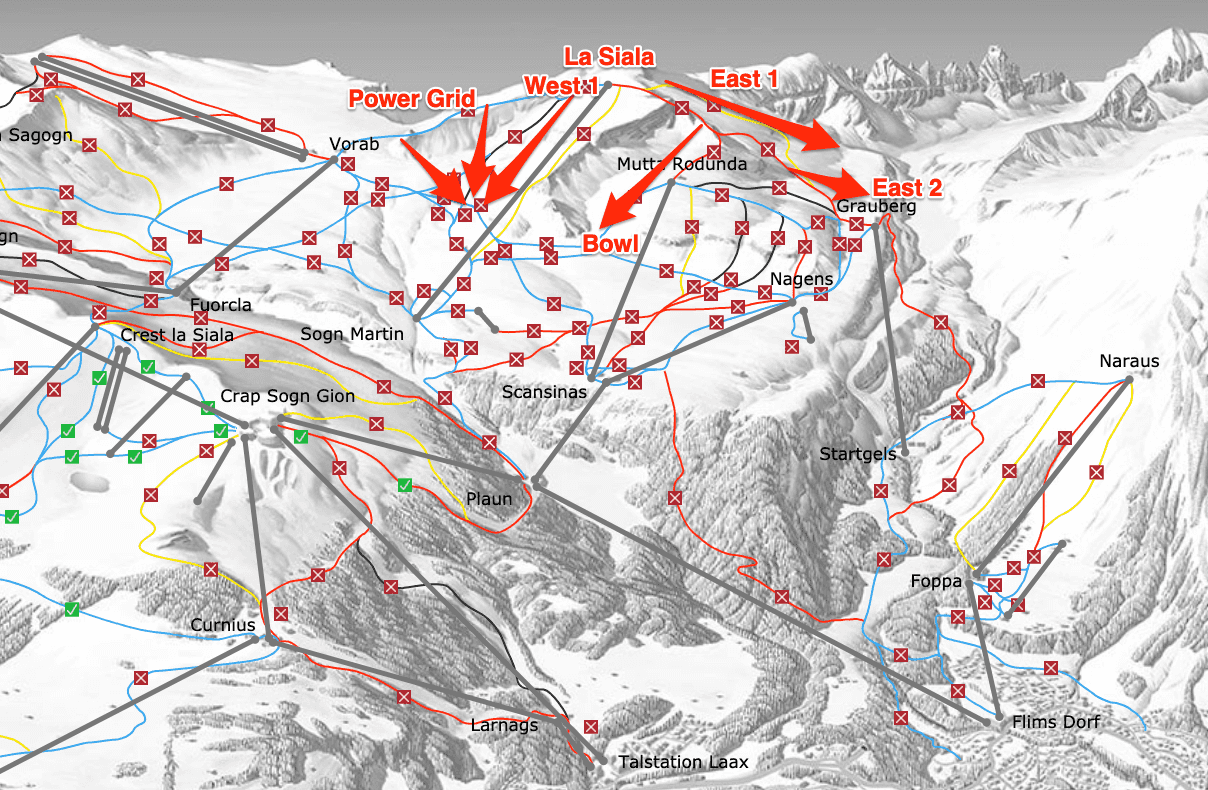 We spend most of our winter weekend in Flims skiing. The kids are training with the skiclub while we enjoy as much freeriding as possible. Here is a bit of breakdown and guide to some easy access rides in Flims. One thing to note is that Flims-Laax-Falera is an area which offers most freeriding in-bounds (i.e. withing the system) with very little effort of access!