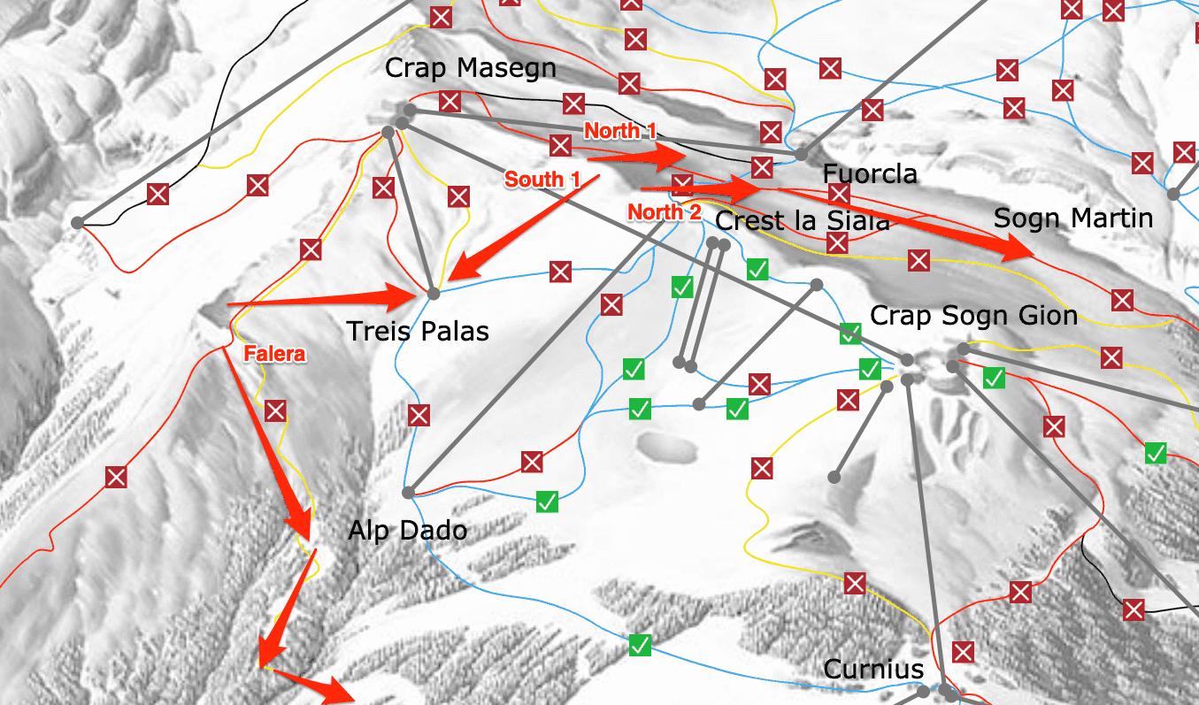 Again follow the hiking trail. Between North 1 and North 2 drop in skiers right (south) follow all the way to the bottom. This is a great run in fresh snow conditions or in spring slush (afternoon in March/April). I generally keep up a bit to the skiers left hitting the lower part of the piste between Alp Dado and Treis Palas - but you can keep skiers right directly in the fall line and hit the piste from Crap Masegn to Alp Dado as well.