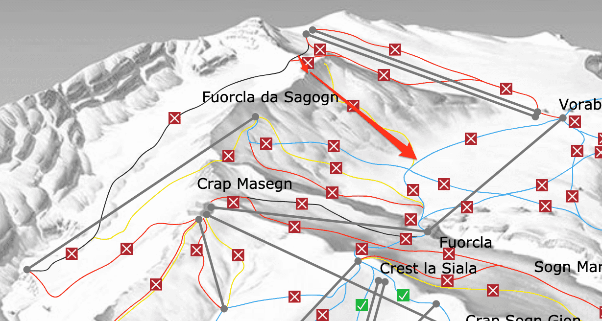 From the Vorab peak you take the piste and keep skiers right up to the saddle. This is the entrence of the black slope. It’s a great slope if you want to ski a good groomer. However, at the saddle your start traverse skiers left until you cross over the ridge on your left hand side. Once on top of the ridge you can basically choose your path as you like. It is also possible to hike to the peak (from the start of the traverse) as this is a marked off-piste run.